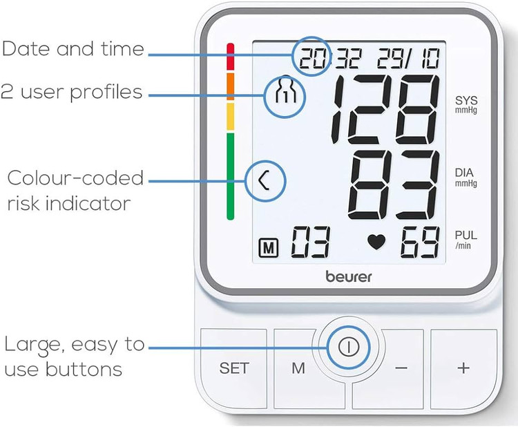فشارسنج دیجیتال بیورر مدل BM51 ، تنها با فشار دادن یک دکمه فشارخون و میزان ضربان قلب شما را با دقت بسیار بالا اندازگیری میکند. این محصول دارای ابعاد بزرگ و رنگ زمینه آبی بسیار خوانا میباشد. فشارسنج بیورر BM51 ، دارای قابلیت هشدار استفاده نادرست، تشخیص اختلالات قلبی، نشانگر ریسک و هشدار تعویض باتری میباشد. منبع تغذیه آن 4 عدد باتری قلمی 1.5 ولت بوده که برای جلوگیری از اتلاف انرژی در صورت عدم استفاده، به طور خودکار خاموش میگردد. همچنین شما میتوانید به صورت جداگانه برای محصول آداپتور تهیه فرمایید. کاف این محصول از مدل ابتکاری کلیپسی برای سهولت در استفاده است و اندازه کاف برای دور بازو 22-42 سانتی متر میباشد.