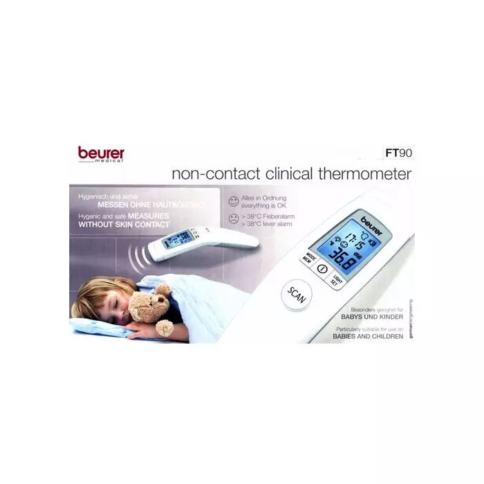تب سنج دیجیتال بیورر مدل FT90 به دلیل غیر تماسی بودن بسیار ایمن و بهداشتی بوده و حتی می توان برای اندازه گیری دمای شیر یا غذای کودکان و یا آب حمام نیز مورد استفاده قرار داد. منبع تغذیه دستگاه دو باتری نیم قلم بوده و جهت صرفه جویی در مصرف، مجهز به سیستم خاموشی خودکار می باشد.همچنین این دماسنج دارای نمایشگر بزرگ و خوانا بوده و تا 60 اندازگیری شما را ذخیره میکند و در صورت داشتن تب، شما را با آلارم متوجه خواهد کرد.