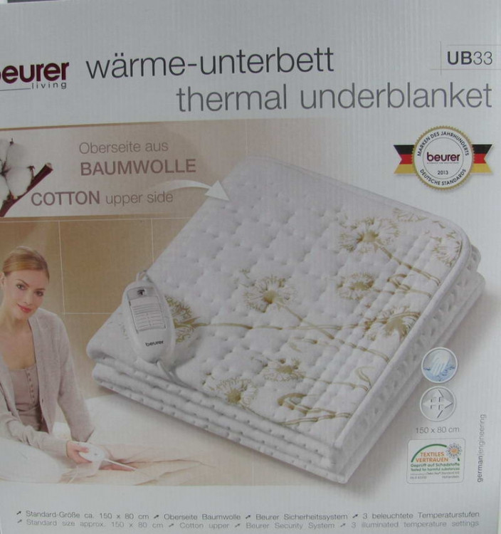 تشک برقی UB33 بیورر ، تولید شده با رویه پنبه و سازگار با پوست بوده و باعث ایجاد حساسیت نمیشود، رویه تشک با طرح گل بوده و ابعاد آن 80*150 سانتی متر است. این تشک در سه سطح دمای قابل تنظیم ، گرمای مورد نیاز شما را تامین میکند. این محصول قابل شستشو بوده و در ماشین لباسشویی در دمای 30 درجه سانتیگراد قابل شستشو است.