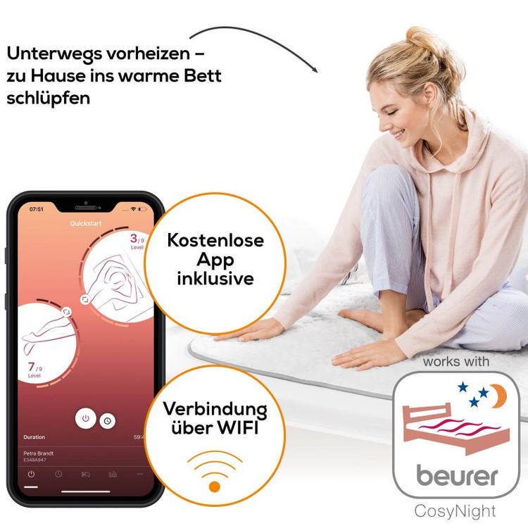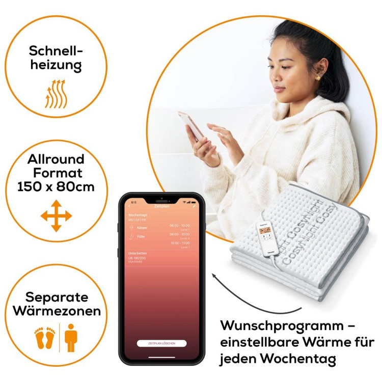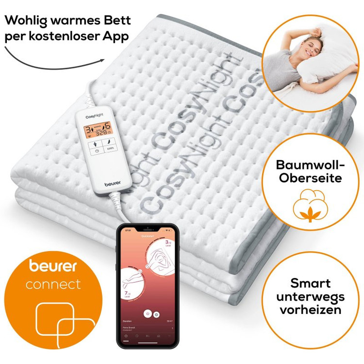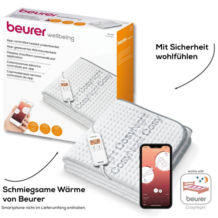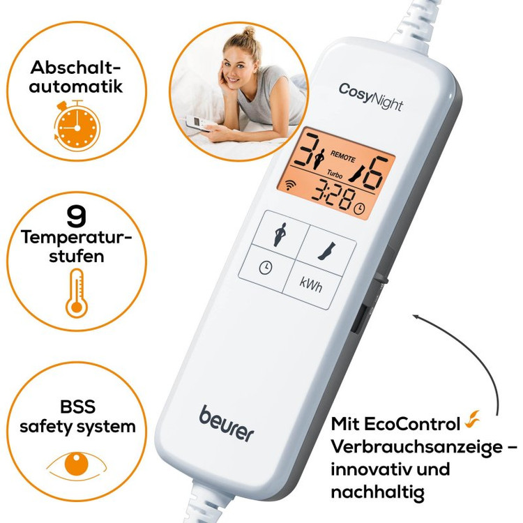 تشک برقی بیورر UB190 BEURER دارای تنظیمات دمایی پیشرفته ای است که امکانات متفاوتی را برای کاربر فراهم می کند.تنظیمات دمایی تشک به این صورت است که در هر ۳ ساعت دما یک درجه کاهش پیدا می کند و از تنظیمات 9 به 8 و سپس به پایین برمی گردد،این ویژگی از وقوع خطرات احتمالی و سوختگی جلوگیری کرده و همچنین از گرم شدن بیش از حد کاربر و آسیب های فیزیکی در هنگام خواب نیز پیشگیری می کند.تشک الکتریکی بیورر UB190 همچنین به سیستم خاموشی خودکار نیز مجهز است و پس از ۱۲ ساعت استفاده مداوم و روشن ماندن به صورت خودکار خاموش می شود.رویه محصول دارای استاندارد جهانی اکوتکس و دوستار پوست بدن بوده و ضد حساسیت میباشد.تشک UB190 BEURER دارای ارتباط WLAN بوده بنابراین بوسیله نرم افزار beurer CosyNight software قابل مدیریت از راه دور برای خاموش کردن یا روشن کردن و تنظیمات دیگر میباشد